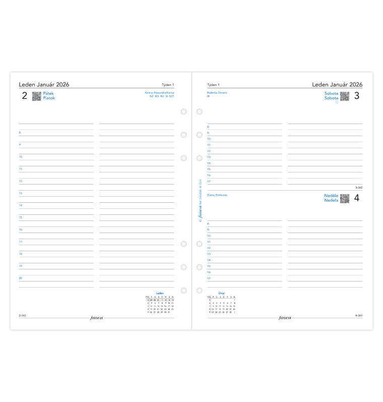 Kalendár veľkosti A5 v českom a slovenskom jazyku s rozložením deň na jednu stranu, linajkový s vyznačeným časovým plánom. K dispozícii máte prehľad aktuálneho mesiaca, týždňa v roku, menín a štátnych sviatkov.