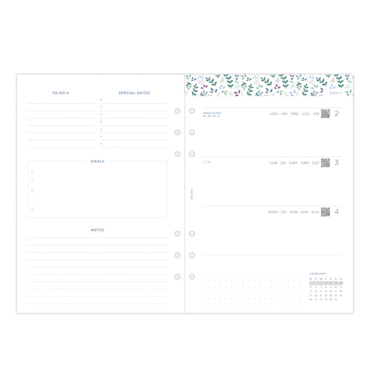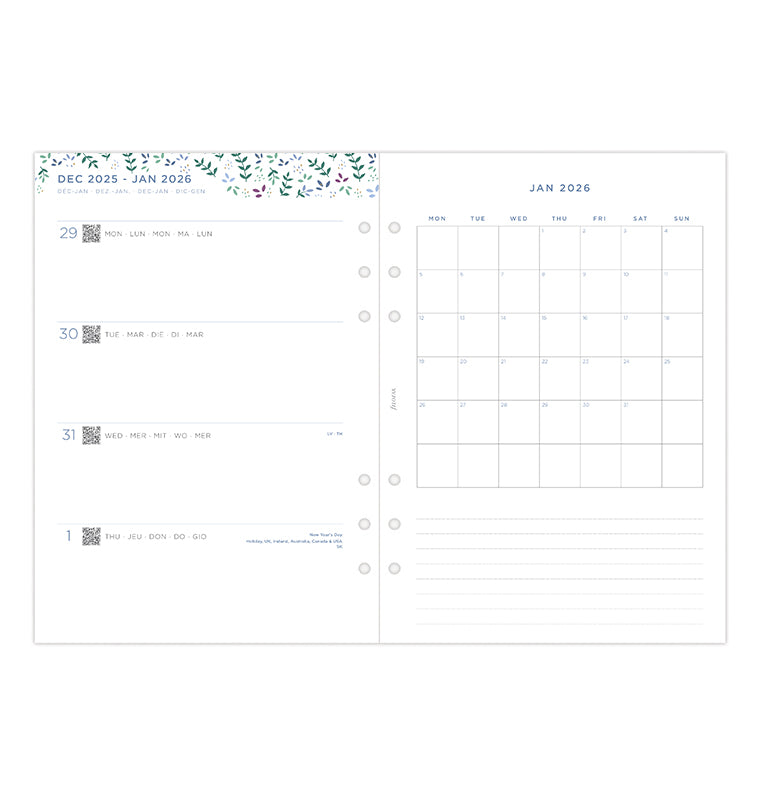 Plánujte dopredu s našim diárovým setom z kolekcie Garden. Táto rozkvitnutá náplň veľkosti A5 ponúka kalendár s rozložením týždeň na 2 strany horizontálne s krásnymi grafickými detailmi pre podporu Vašej kreativity a radosti. Pre väčšiu osobitosť sada obsahuje stránku "Diár patrí". K dispozícii máte plánovací kalendár súčasného i nasledujúceho roka, aby ste mohli plánovať dopredu, alebo za mesiac prehľad tých najdôležitejších udalostí, čo Vás čakajú. Každý mesiac navyše má bodkovaného stránky "Big Plans" (veľké plány), ktoré sú určené pre Vaše mesačné úlohy. A pretože je dôležité tiež mať priestor pre poznámky a nápady, na konci kalendára nájdete aj bodkované a linajkované stránky, ideálne pre vaše poznámky alebo myšlienky. Viacjazyčné prevedenie. Papier vhodný pre plniace perá.