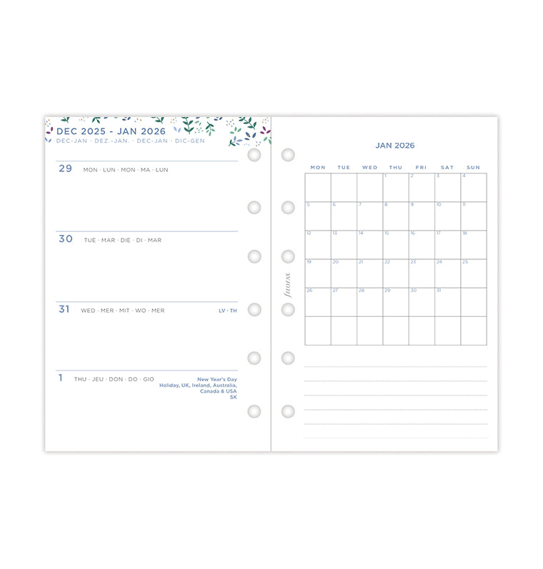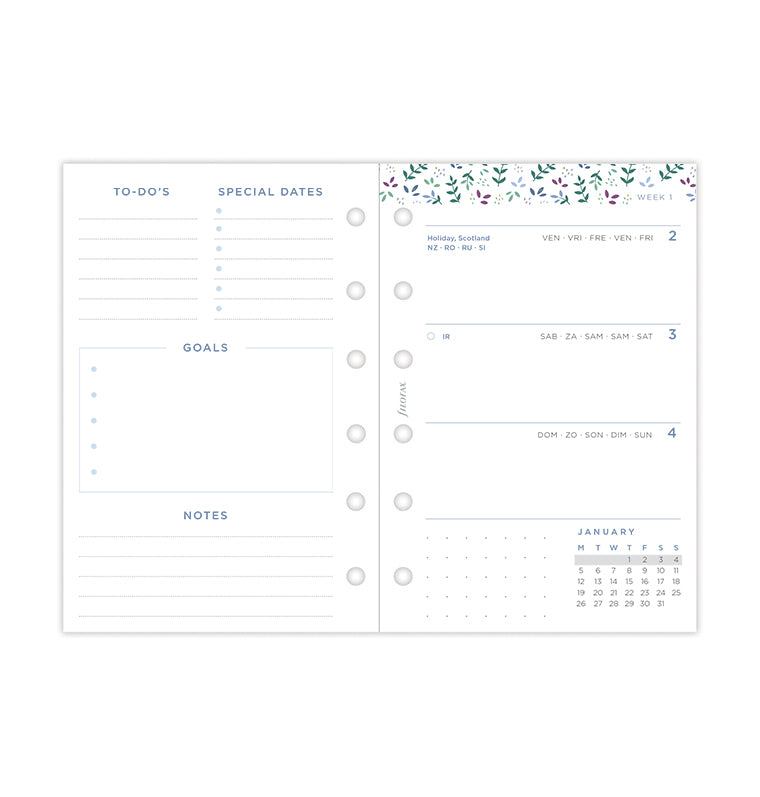 Plánujte dopredu s našim diárovým setom z kolekcie Garden. Táto rozkvitnutá náplň veľkosti Vrckový ponúka kalendár s rozložením týždeň na 2 strany horizontálne s krásnymi grafickými detailmi pre podporu Vašej kreativity a radosti. Pre väčšiu osobitosť sada obsahuje stránku "Diár patrí". K dispozícii máte plánovací kalendár súčasného i nasledujúceho roka, aby ste mohli plánovať dopredu, alebo za mesiac prehľad tých najdôležitejších udalostí, čo Vás čakajú. Každý mesiac navyše má bodkovaného stránky "Big Plans" (veľké plány), ktoré sú určené pre Vaše mesačné úlohy. A pretože je dôležité tiež mať priestor pre poznámky a nápady, na konci kalendára nájdete aj bodkované a linajkované stránky, ideálne pre vaše poznámky alebo myšlienky. Viacjazyčné prevedenie. Papier vhodný pre plniace perá.