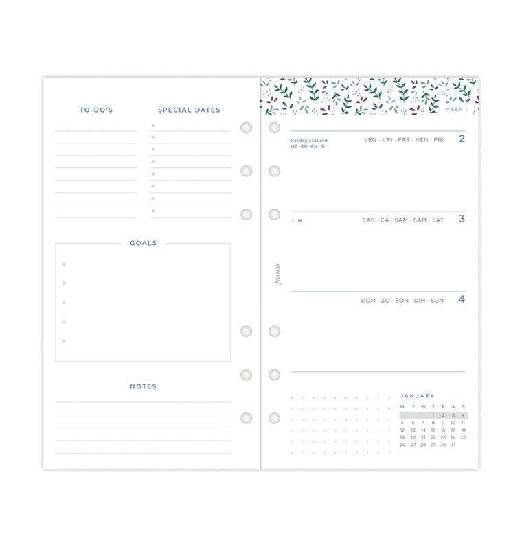Plánujte dopredu s našim diárovým setom z kolekcie Garden. Táto rozkvitnutá náplň veľkosti Osobný ponúka kalendár s rozložením týždeň na 2 strany horizontálne s krásnymi grafickými detailmi pre podporu Vašej kreativity a radosti. Pre väčšiu osobitosť sada obsahuje stránku "Diár patrí". K dispozícii máte plánovací kalendár súčasného i nasledujúceho roka, aby ste mohli plánovať dopredu, alebo za mesiac prehľad tých najdôležitejších udalostí, čo Vás čakajú. Každý mesiac navyše má bodkovaného stránky "Big Plans" (veľké plány), ktoré sú určené pre Vaše mesačné úlohy. A pretože je dôležité tiež mať priestor pre poznámky a nápady, na konci kalendára nájdete aj bodkované a linajkované stránky, ideálne pre vaše poznámky alebo myšlienky. Viacjazyčné prevedenie. Papier vhodný pre plniace perá.