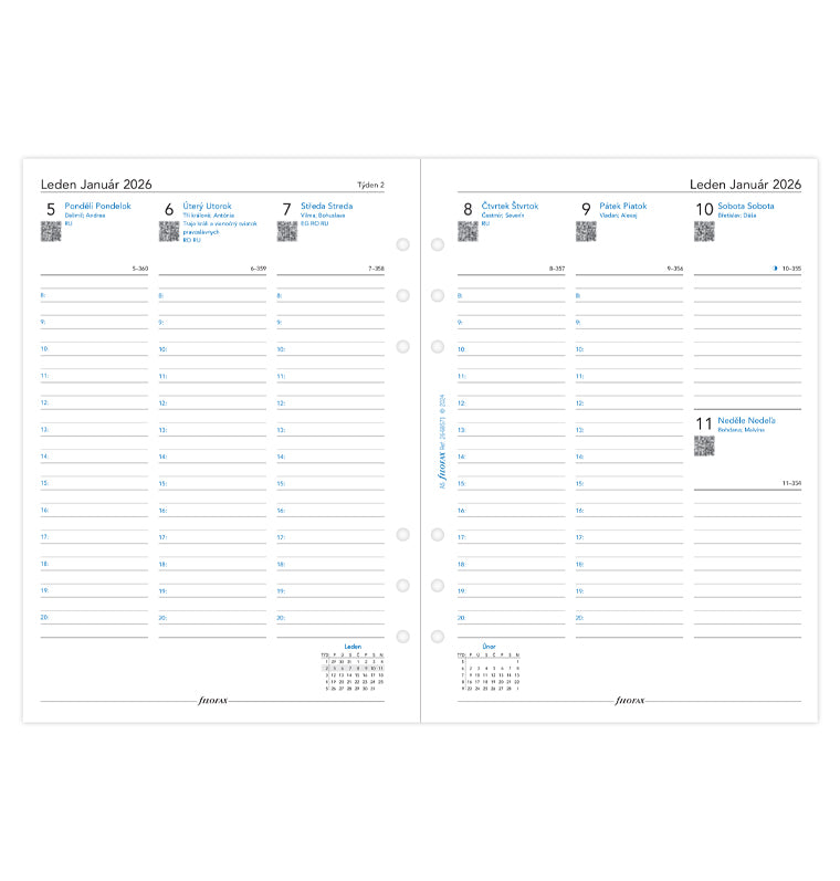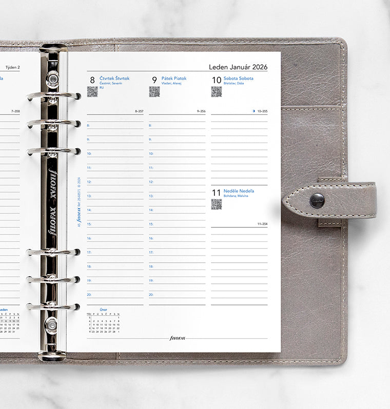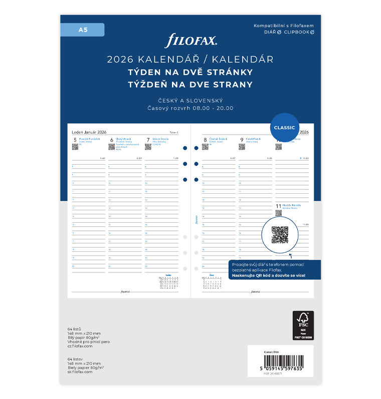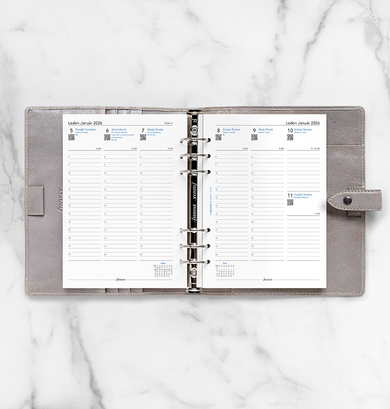 Kalendár veľkosti A5 v českom a slovenskom jazyku s rozložením týždeň na 2 strany s časovým plánom. K dispozícii máte rýchly prehľadom aktuálneho mesiaca, týždňa v roku, menín a štátnych sviatkov.